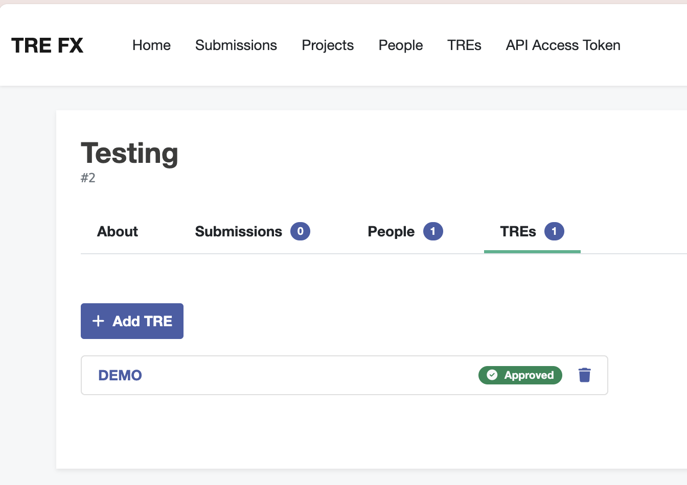To make sure that the project has been approved and Submission Layer is in sync with TRE Agent, choose the project in Submission layer and navigate to the TREs section. You should see Approved status for the TRE.